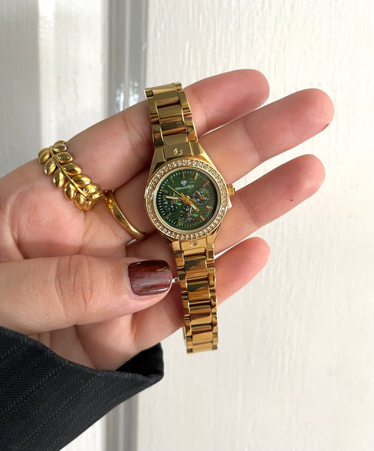 ✨CRYSTAL STUDED GREEN DIAL GOLD WATCH✨