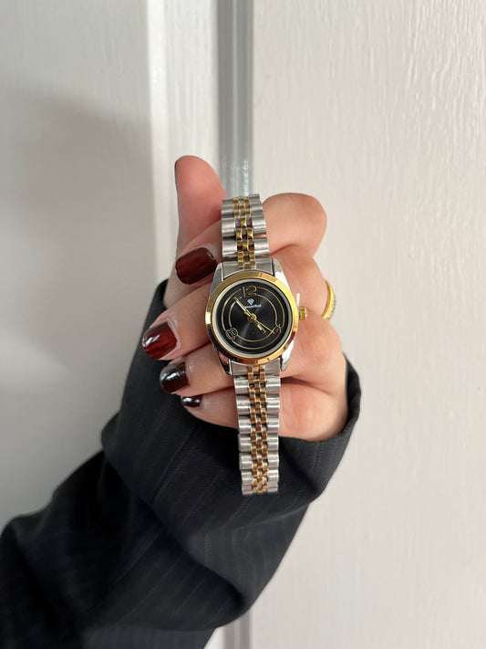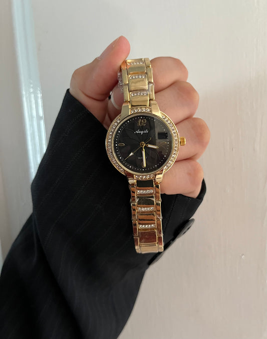 ✨CRYSTAL STUDED TWO TONE BLACK DIAL GOLD WATCH✨