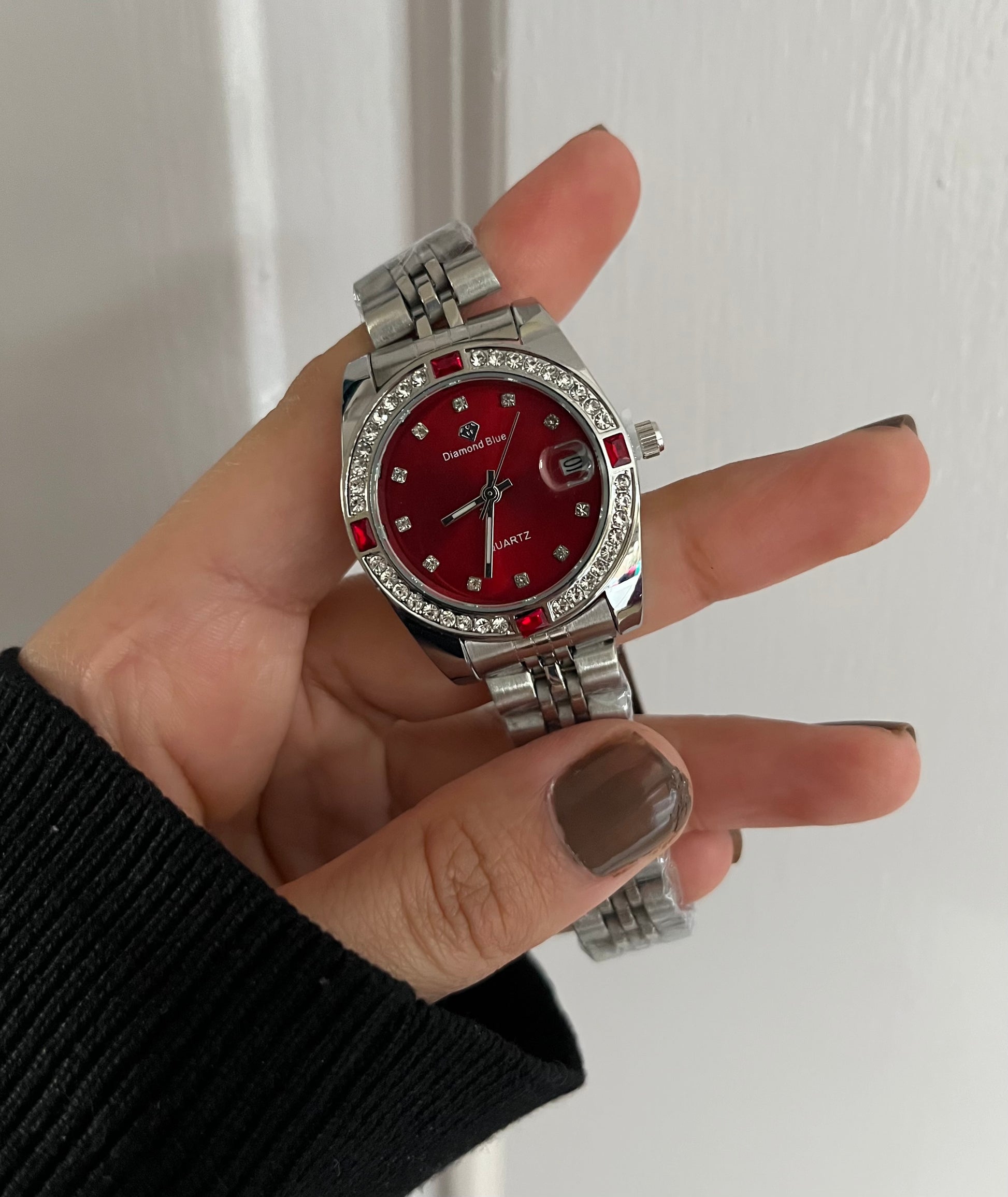 A classy stainless steel watch featuring a deep red dial with crystal hour markers and a sparkling stone-embellished bezel. Designed with a sleek metal strap and quartz movement, it’s a perfect elegant piece for everyday wear or special occasions.