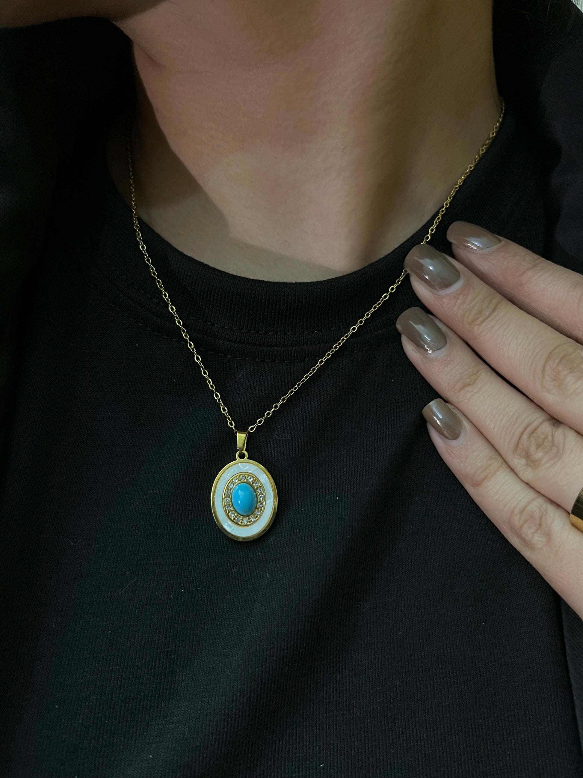 A captivating 18k gold-plated pendant featuring a serene turquoise stone framed with delicate zircon accents.